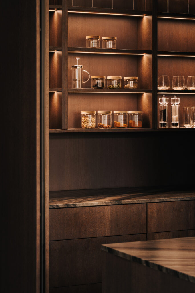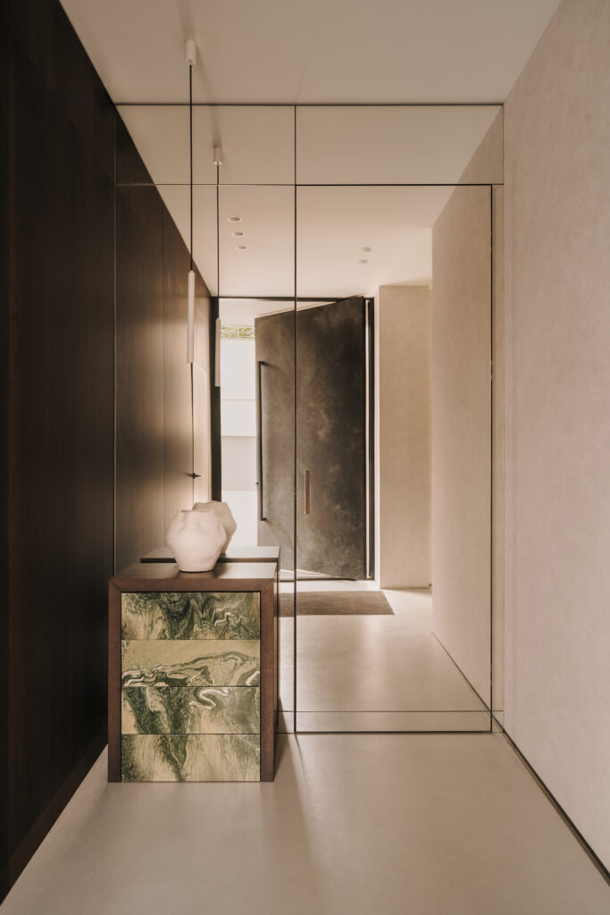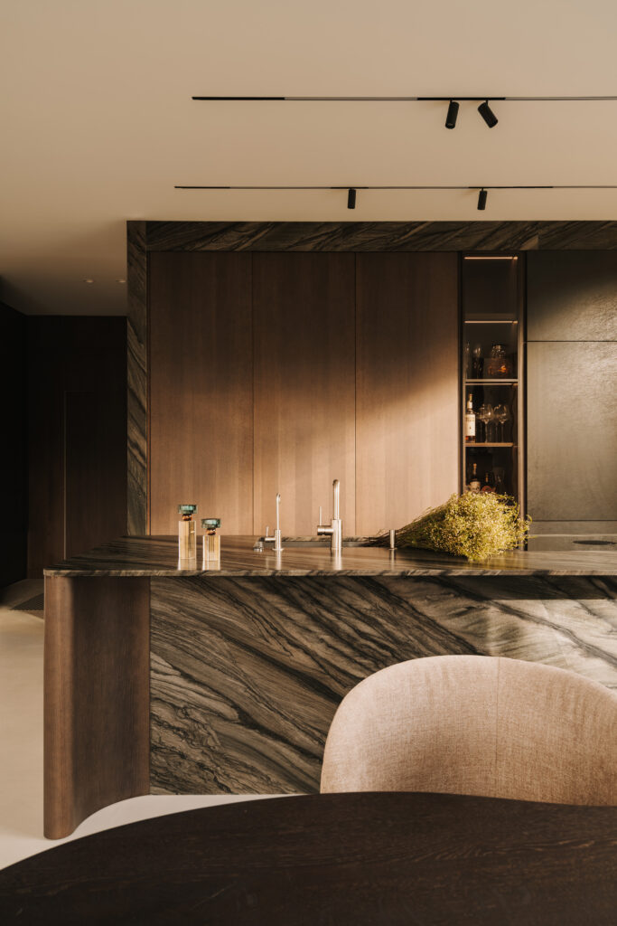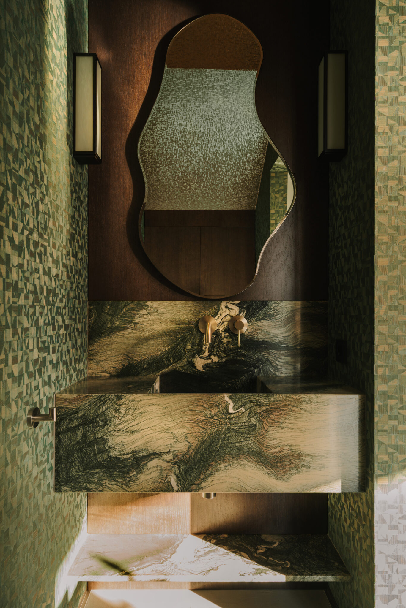 The private spaces continue this language of quiet luxury. The master bedroom showcases the Clip bed by Ditre Italia, surrounded by wood-paneled walls and mirrored wardrobes. The adjoining bathroom blends seamlessly with a marble double vanity. A standout moment of the project is the powder room, fully clad in Cipollino Verde marble -a dramatic centerpiece of texture and color.